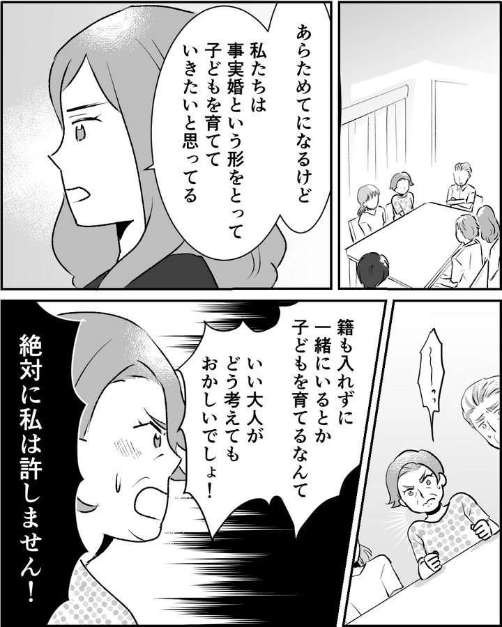 迎えた当日…予想はしていましたが、両親は「事実婚なんて認められない!」と強く反発したのです。この話し合い、一体どうなるの…!?