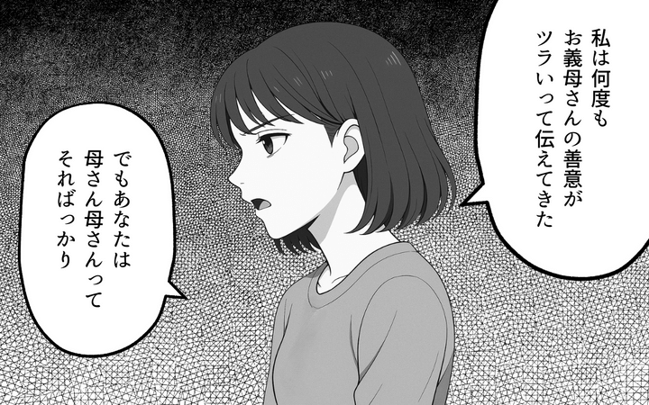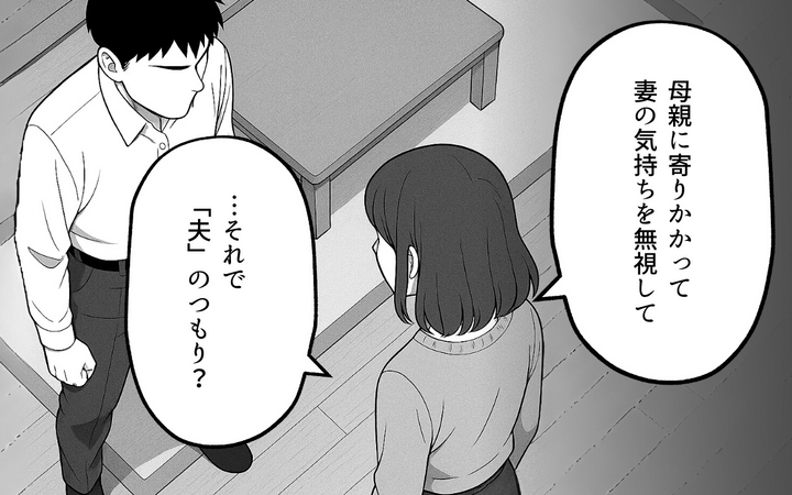 【これまでのあらすじ】妻が義母に善意の押し付けをやめてほしいと訴えた夜、帰宅した夫は一方的に妻を叱りつけてきた。義母の味方をするばかりで妻の気持ちをまったく理解しようとしない夫に、妻は失望するのだった。