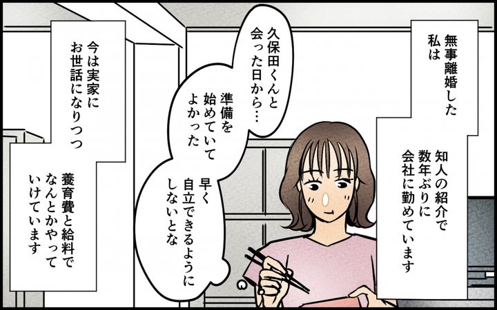 離婚後、私は正社員として働き始めました。以前夫の同僚で私の元同僚でもある久保田くんに会った日、私は元上司に連絡し取引先の会社を紹介してもらっていたのです。(夫と同じ会社に復帰するのは嫌だったので…)