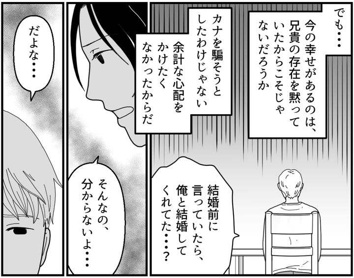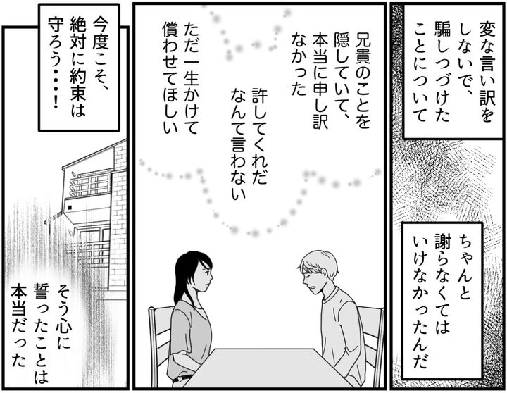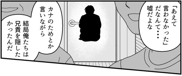 俺や両親は自分たちの保身のために兄貴の存在を隠しつづけてきた。でももうこれ以上カナの信用を失いたくない。俺はその一心で、二度とカナを裏切らないと心に誓った。