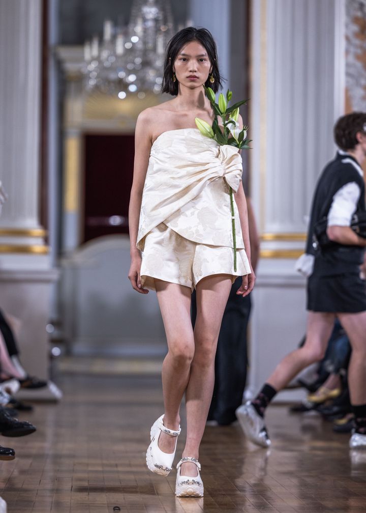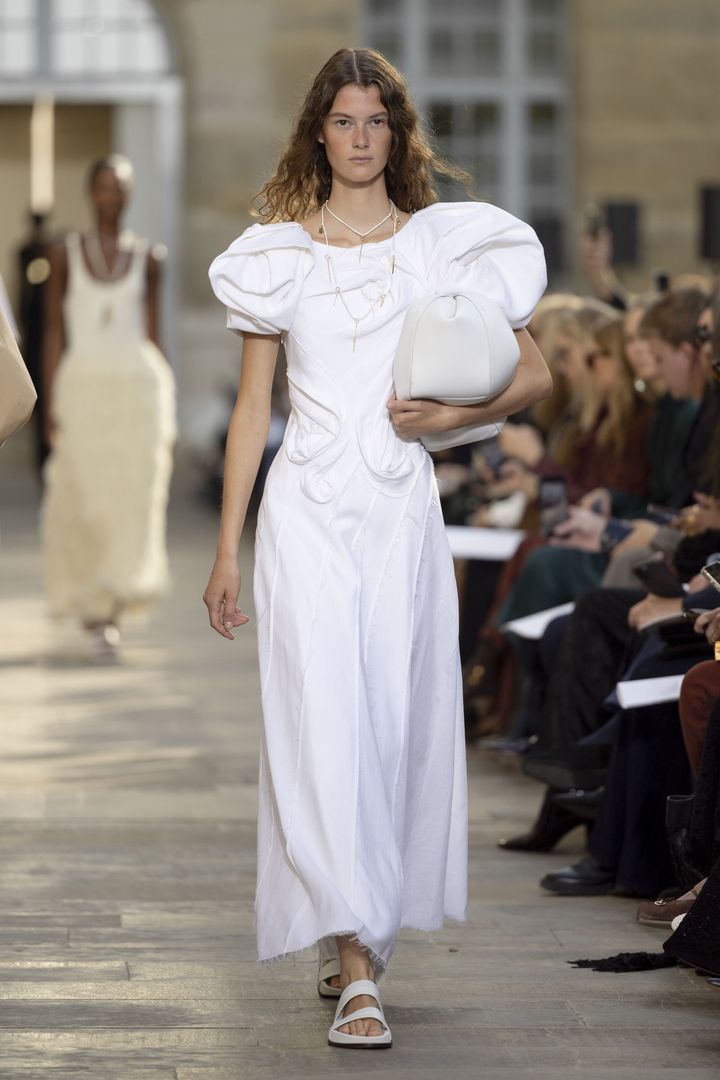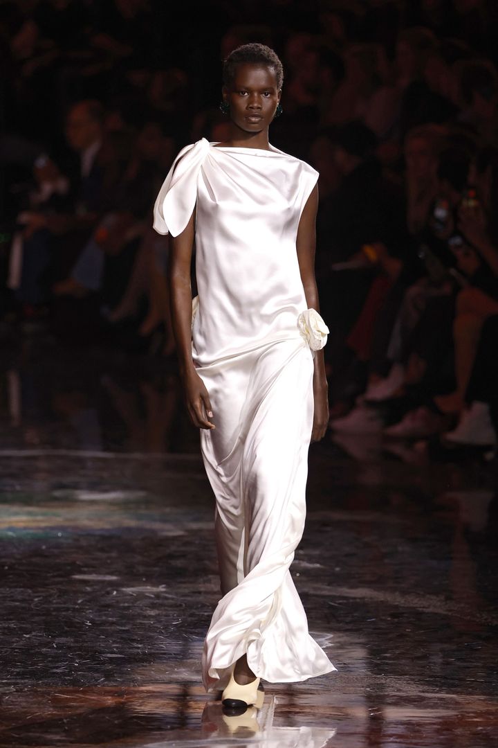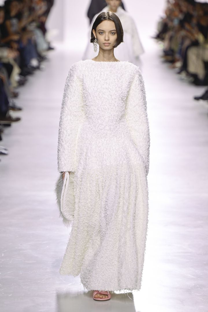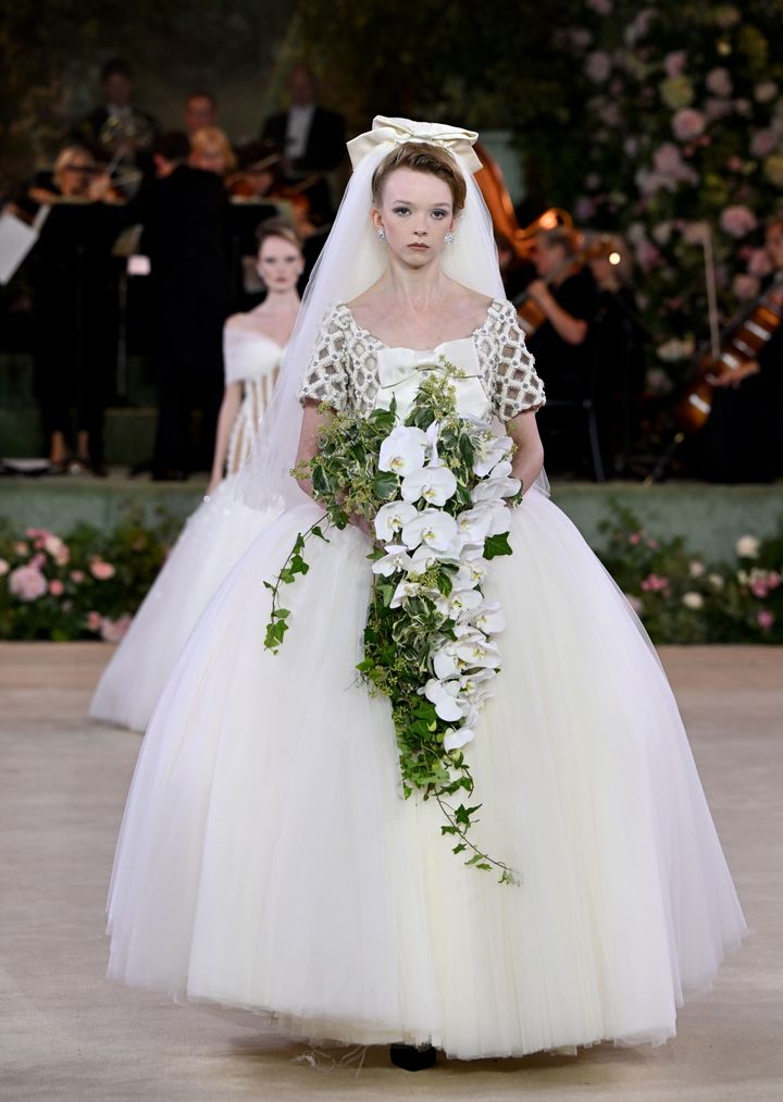 ジョナサン・アンダーソンをクリエイティブ・ディレクターに迎えた新生ディオールからは、メゾンを象徴するリボンモチーフがあしらわれたミニドレスが登場。程よい甘さが大人の花嫁向きです。
