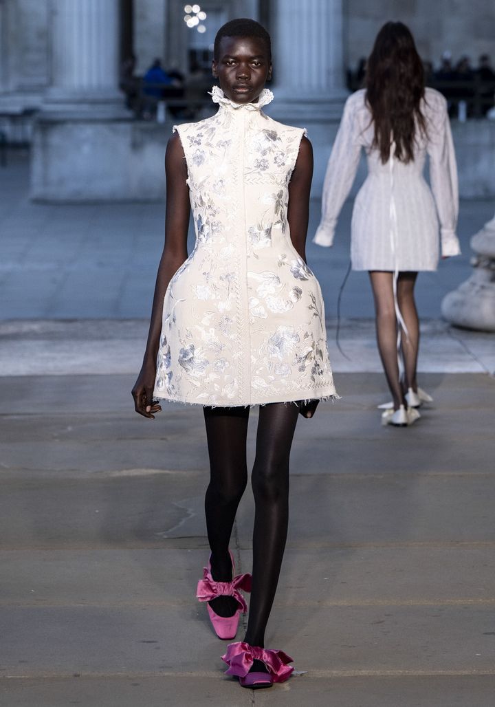 リッチなシルバーのブロケード、装飾的な立ち襟がヴィクトリアンムードを醸し出したミニドレス。ピンクのリボンシューズで甘いアクセントを加えて。