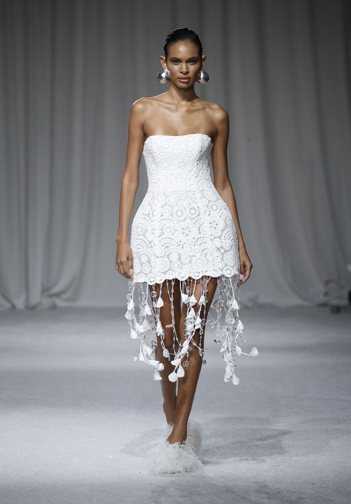 ヘムラインにクリスタルやレースのフリンジが施された、ボディコンシャスなミニドレス。ボールのようなシルバーのイヤリング、フェザーシューズもプレイフルなムード満点です。