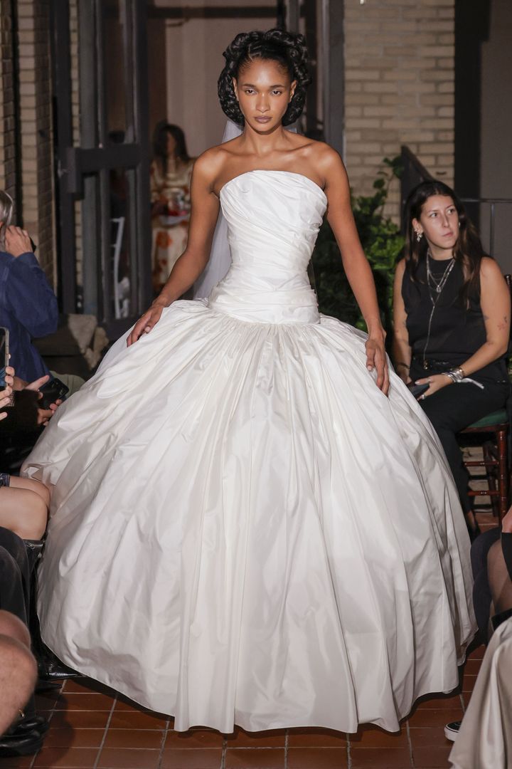 モード派に人気のNY発ブランドからは、コンパクトなボディス、ボリューミーなスカートのコントラストの効いたウエディングドレスが登場。ミニマルでありながら映えるシルエットが大人の花嫁向き。