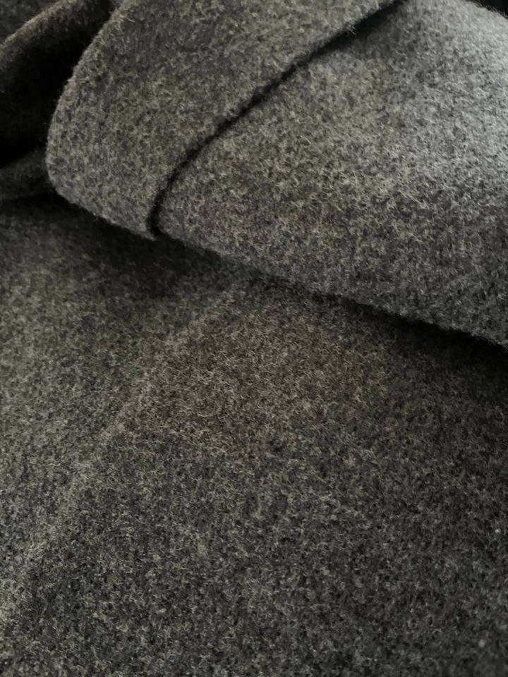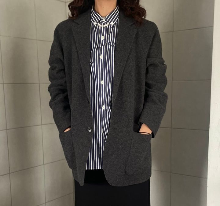 このジャケットの存在は知っていたのですが、ニットジャケットなので今回の候補からは除外していたんです。その理由は、ニットは着ていくうちに伸びそうだし、ジャケット特有のきちんとした印象が薄まりそうだから。でも、その考えが間違っていたのは、手に取った瞬間わかりました。ニットではあるのですが、かなり密に編まれているようで、伸縮性はそのままにしっかりとした生地感だったんです。これは縮絨加工によって実現しているそうですが、それによってフランネルやツイードといった紡毛系の風合いなのも◎。もうこの時点でお値段以上だったのですが、実際に着てさらにド肝を抜かれました。