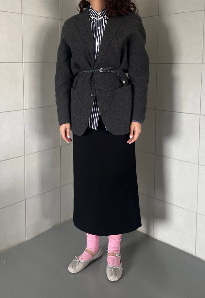 このジャケットを使ってやりたかったのがウエストマークです。2025年秋冬のランウェイでも多く見かけていたので、ぜひともチャレンジしたかったんですよね。というわけで、比較的バランスが取りやすい細ベルトを巻いてみました。そしたらなんてことでしょう。めっちゃ洒落るじゃないですか! そのまま着るのも嫌いじゃないですが、合わせるボトムスによってはウエストマークしたほうが断然イイ。