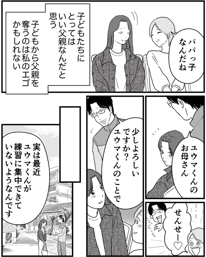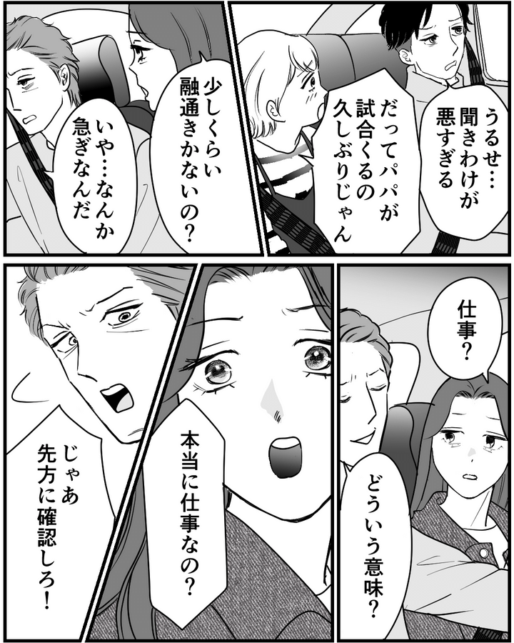 私の不安をよそに、夫はのんきに遅れて応援にやって来ました。せっかく家族の時間を過ごそうとしていたとき、仕事に戻ると言い出す夫…。車内に険悪な雰囲気が漂います。