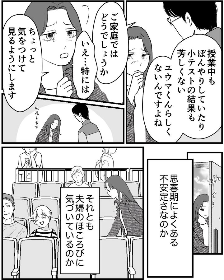 先生からは「ユウマくん(息子)が最近集中していない」と言われる始末。もしかしたら、夫婦のもめごとが子どもに影響してしまったかもしれません。
