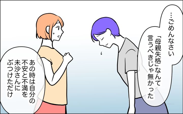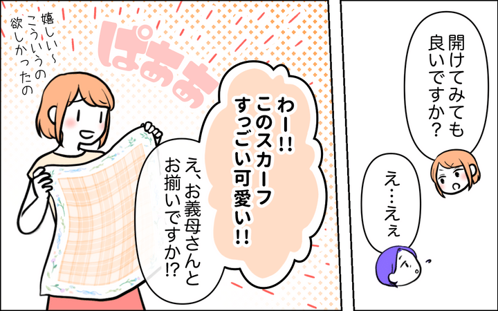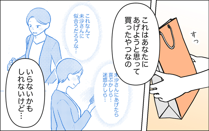 私は初めて嫁に謝りました。「母親失格」と言ってしまったこと、ずっと羨ましかったこと、未沙さんに近づきたくて真似したこと…。嫌がられるのも覚悟で、プレゼントを渡せば、彼女はスカーフも限定コスメも喜んでくれて…。
