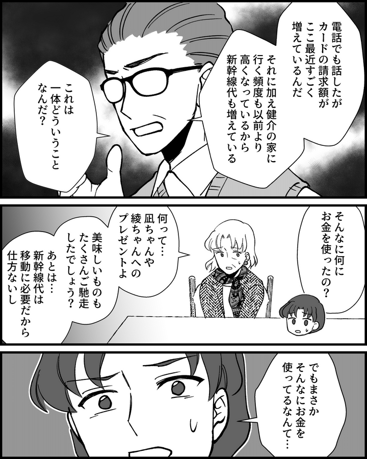 義父からカードの支払いについて問い詰められた義母は、従妹宅に逃げ出してしまったようです。困り果てた義父と私たちは義母を交えて、家族会議をすることになりました。