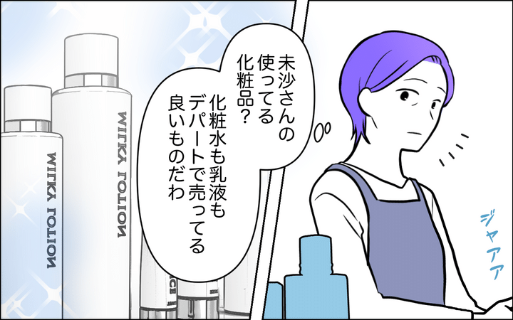 しかしある日、未沙さんの使っている化粧品がデパートで売っている高価な物だと気づいたのです。たしかに肌は綺麗ですが、若い時からこんな良いものを使うなんて…。すると洋服もどこのブランドかが気になってしまって…。
