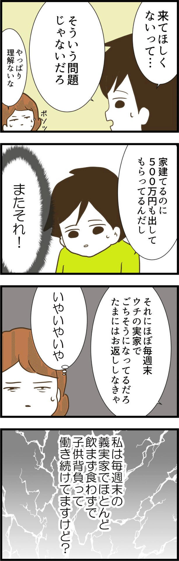 結婚を機に専業主婦となった主人公・さゆは、義実家での毎週の食事会に悩まされていました。夫に不満を伝えても、新築の援助金を出してもらったのに文句を言うべきではないと妻の気持ちは全く理解してもらえません。ママ友と母に相談してみると、大変さは理解してくれるものの、娘のために我慢するべきだと言います。自分の人生はどうなるの…?とモヤモヤしている妻にさらなる悲劇が。今週末は義両親と義姉親子が家に来ると聞かされたうえに、夫は「準備しといてよ」と丸投げ。夫の理解を得たい妻は、この家に来てほしくないと本音を伝えてみました。