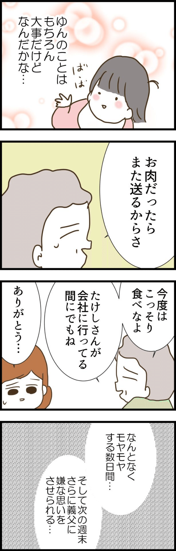 義実家から援助を受けて一軒家に引っ越した主人公・さゆ。しかし義実家に毎週食事会に行っては酒癖の悪い義父のお酌を強要されるのです。妻の不満を知った義父は離婚して構わない!と怒鳴りますが、義姉が仲裁に入ります。それは優しさではなく、将来義父の世話を妻に押しつけるためでした。夫は義実家で手伝いするのは当然のこと、500万も援助を受けておいて文句を言うべきではないと言います。ママ友に相談すると、妻さえ我慢すれば娘は幸せに暮らせると言われ、胸が痛みます。みんな我慢して頑張ってるんだ…と思い直しますが、我慢し続けるのも辛い。実母にも相談してみましたが、なんとママ友と同じ意見だったのです。