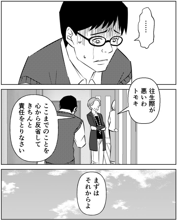 義母は夫を責めるが、夫は「人に優しくしろと言ったのは母だ」と責任転嫁し、さらに義母から責められる。絶えない相手女性・ナオコからの連絡を見た義母はトモキを連れて話をつけに行くのだった。