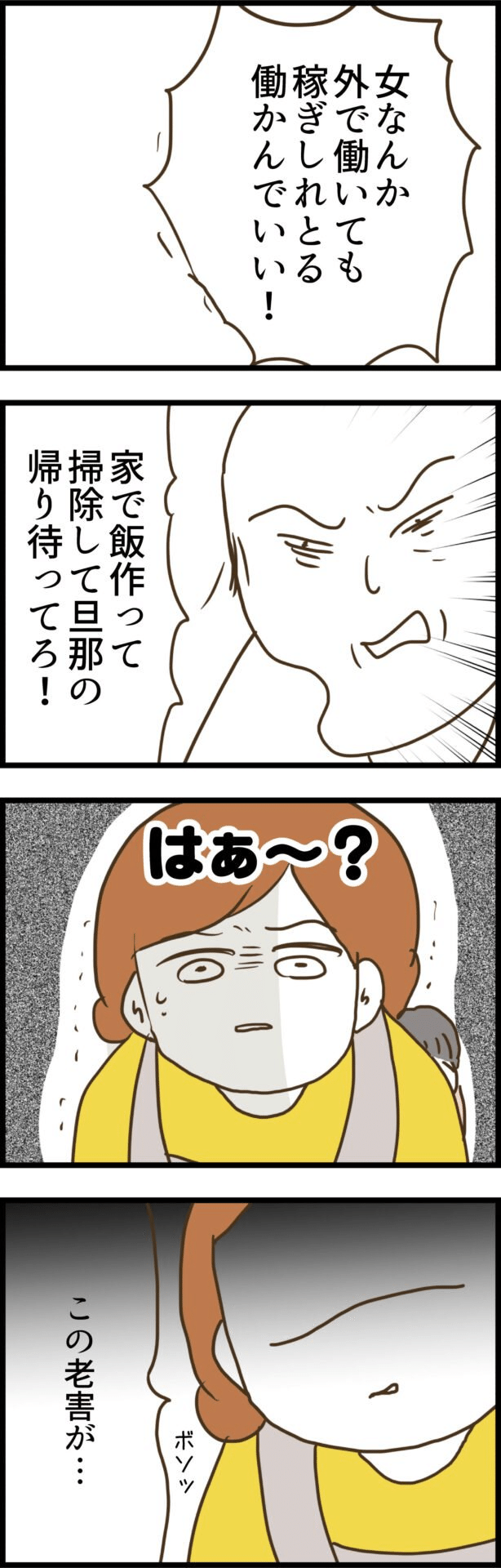 しかし、古臭い考え方をもつ義父は、女は家にいろ!の一点張り。妻はさらに怒りを覚え、思わず「…老害が!」と口にしてしまいます。