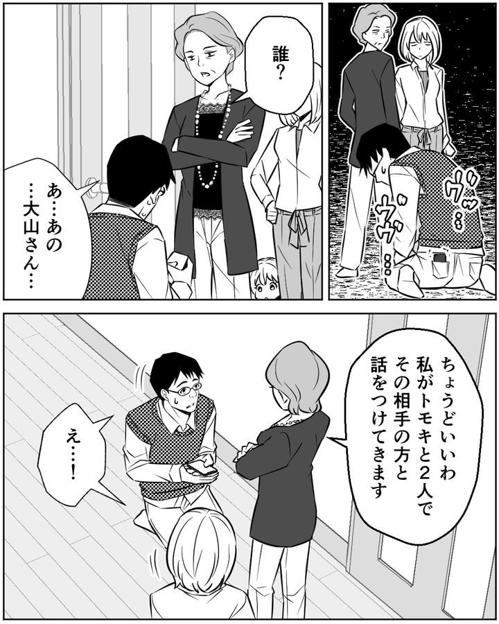 相手女性・ナオコの夫から「まだ関係が続いている」と連絡が入る。トモキと離婚することを決めていた妻はすがるトモキを冷たく突き放す。今さら家族のために動き、離婚を拒むトモキを説得してもらおうと、妻はある人物に相談するのだった。