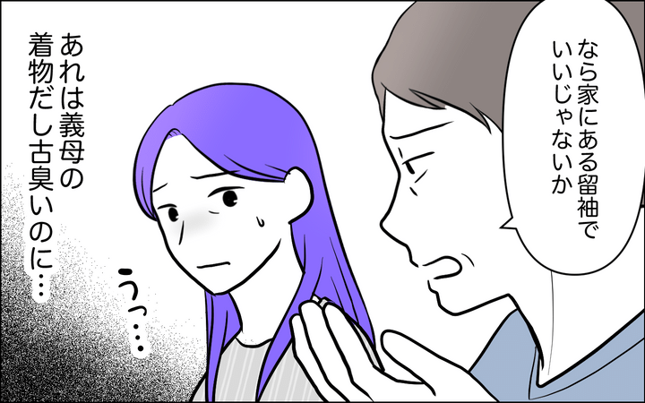 息子の俊介が結婚相手として連れてきたのは、明るいけれど馴れ馴れしい未沙。結婚式の準備が進む中、衣装合わせに同行した恵子だったが、高価なドレスを選びさらに和装も希望する未沙に「私の振袖を着なさい」と言ってしまう。しかし未沙は恵子の振袖を気に入り、恵子はモヤモヤ。「あの子に負けない良いものが着たい」と思い、レンタルするはずが留袖の購入を決め、自分たちの祝儀から払うのだからと費用を式場の結婚費用に入れてしまう。