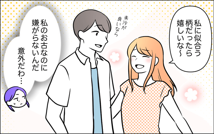 恵子は、息子の俊介と結婚することになった未沙が苦手。初対面から馴れ馴れしい上に、夫も俊介も未沙に甘く、一緒にいるとイライラするのだ。そんな中、結婚式の衣装合わせに同行した恵子は、未沙のウェディングドレス選びも付き合うことに。俊介にちやほやされながら1番気に入った高価なドレスを購入することを決め、さらに「和装もしたい」と言う未沙をワガママに感じた恵子は、「私の振袖を着なさい!」と言ってしまう。