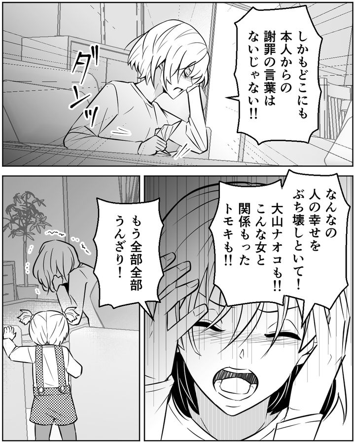 相手女性・ナオコの夫にも関係がバレてしまい、トモキは激しく責められるも対応できず、妻に情けなく助けを求める。お互いに弁護士を入れて話し合うことになったものの、先行きは暗いのだった。