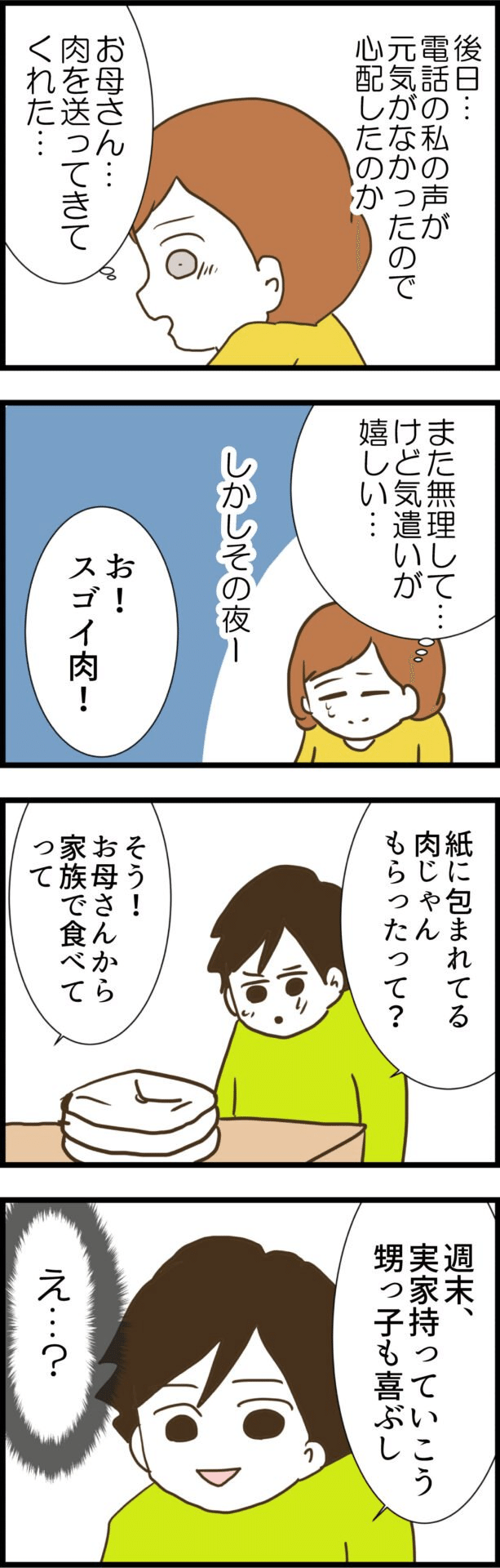 母の優しさが身に沁みて、美味しく頂こうと思っていたのに…。まさかの夫が義実家にお肉を持っていくと言い出したのです…!嫌な予感…!