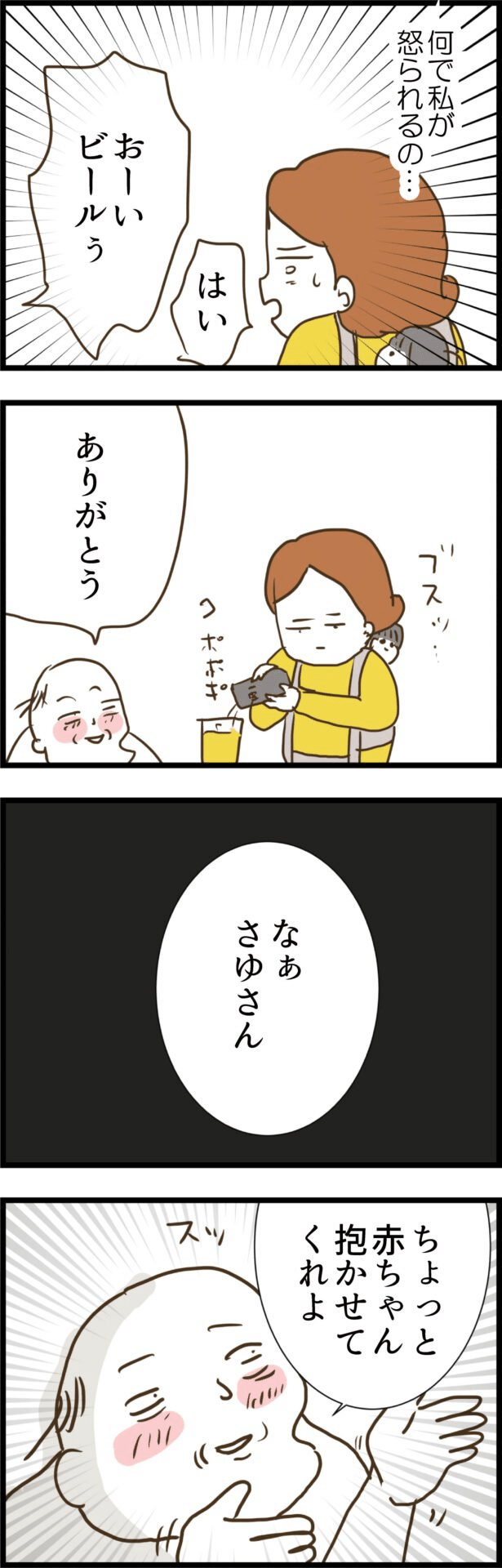 普段はしっかり節約しているのになぜ怒られなければならないのかとモヤモヤしていると、今度は義父からビールの催促が。注ぎに行くと、泥酔した義父が突然娘を抱っこしたいと言い出しました。