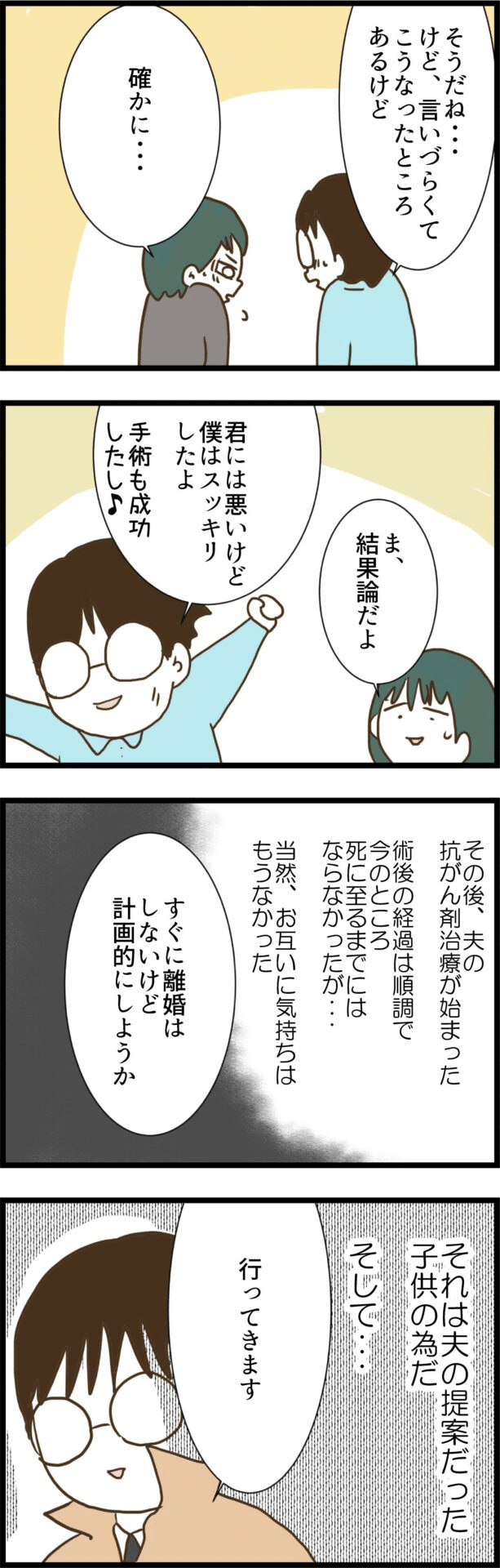 夫の術後の経過は良好で、今のところ命の危険にさらされることもなさそうです。しかし、お互いもう気持ちがないのは明白なため、まずは子どもの成長を優先し、計画的に離婚に向けて動いていくことになりました。