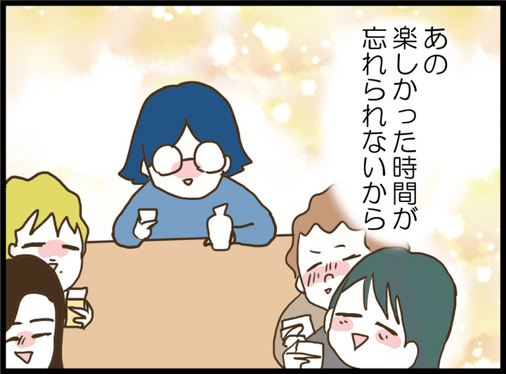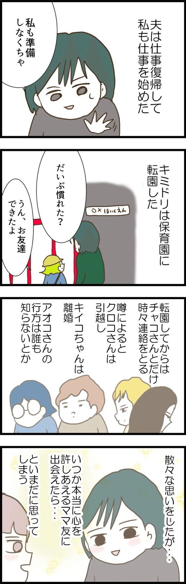 散々な目に遭ったあの事件を思い返すと胸が痛みますが、それでも、仲良くしていたあの頃の思い出は綺麗なまま。これから新しく出会うママ友たちと、そんな関係が築けたら…と願うのでした。