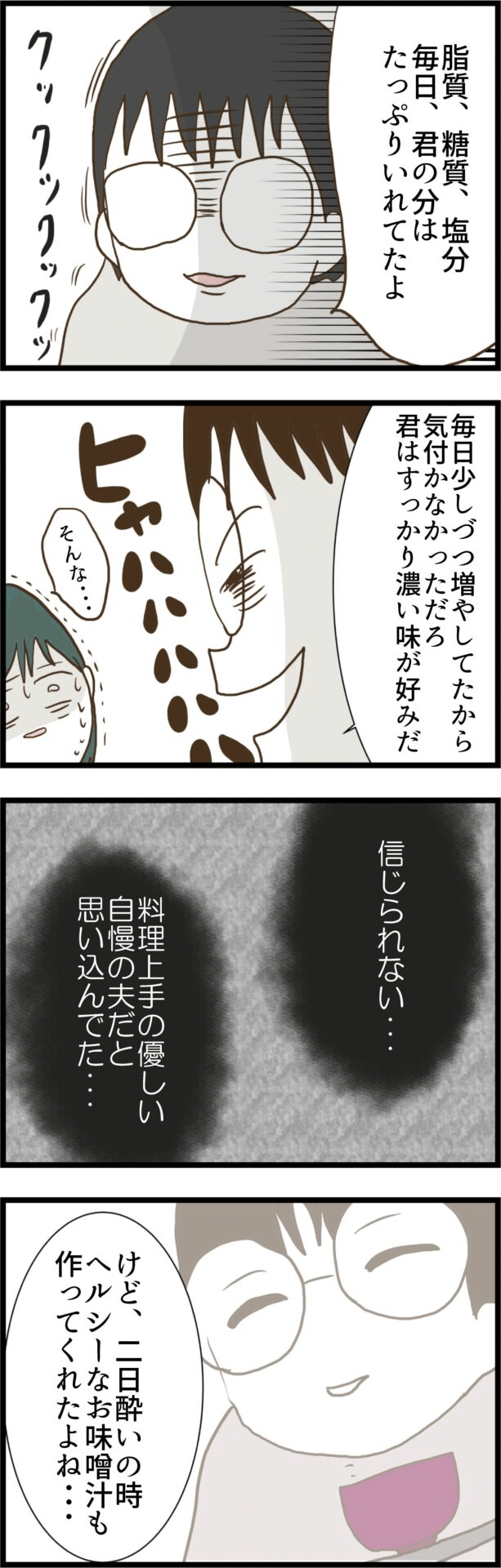 少しずつ増やされていたことで、気付けば濃い味がすっかり好みになっている妻は、自分の体がいつ病気になってもおかしくない状態にあることに気づきもしませんでした。