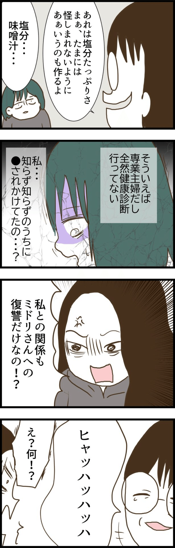 仲良しママ友4人と月一の飲み会を楽しみにしていた主人公・ミドリ。ある日の飲み会で、夫とママ友の誰かが裏切っていることに気づきます。この飲み会がきっかけでママ友グループは完全に分裂してしまい、妻は一人ぼっちに。夫と裏切っている相手を暴くために探偵を雇った妻はついに犯人を突き止めます。ママ友たちを家に呼びだしすべてを打ち明けた妻。夫と裏切っていたのはクロコで、チャコはクロコから金銭援助を受けていたため裏切りを黙認していました。さらにアオコも夫と関係をもっていたことが判明しましたが、あくまで彼女の狙いはママ友の関係を壊すこと。皆の心を巧みに操り、ミドリとクロコの家庭が壊れていくように仕向けていたのでした。妻が夫に説明を求めると、夫は妻がずっと嫌いだったと告白。産後に夫婦の時間を求めたけれど、酷い言葉で拒否されたことを根に持っており、復讐のためにママ友たちと関係を持ったと言うのです。さらに料理担当だったことも、何か関係があるようで…。