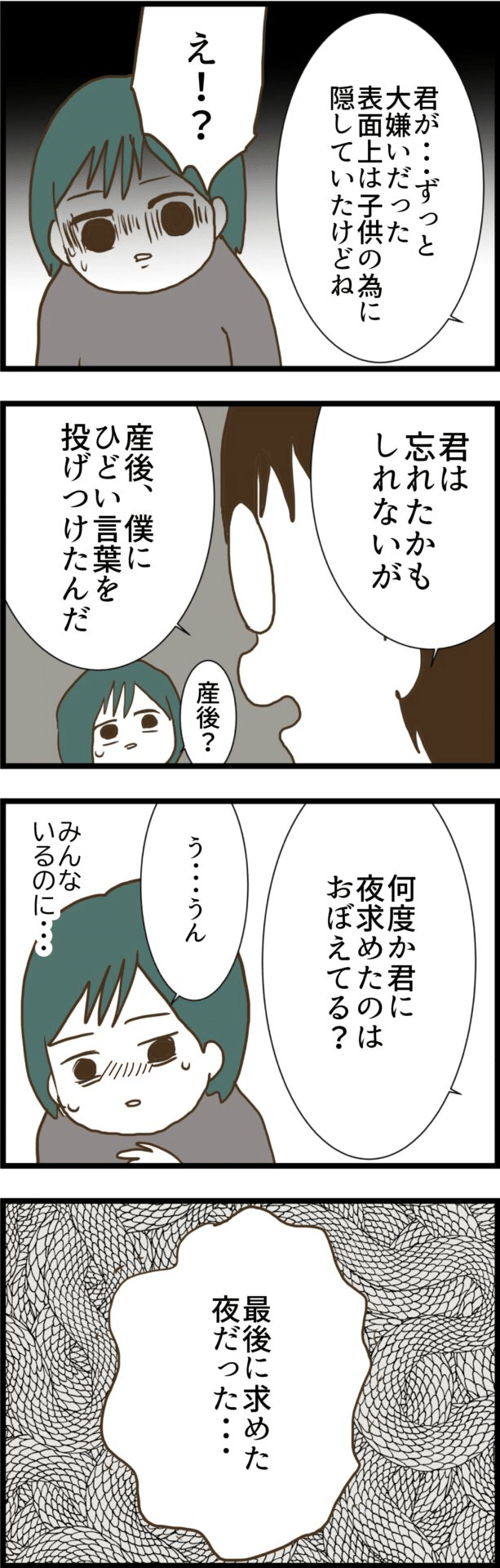 産後間もなくして、何度か夫婦の時間を作ろうとした夫。しかし妻は夫を受け入れることができず、酷い言葉を浴びせていました。
