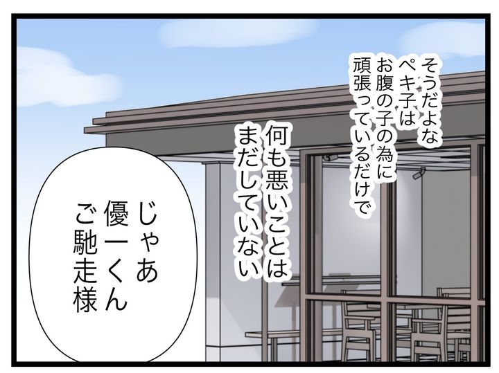 ペキ子はお腹の子のために頑張っているだけで、何も悪いことはしていない。だからこそ、「今は黙って見守ろう」と心に決めて、家へと向かうのですが…。