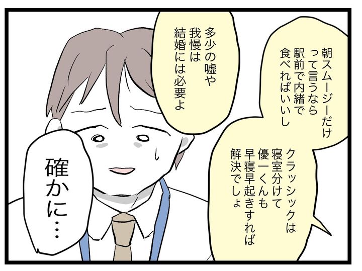 今は妊娠初期だからないだけで、もしこの先つわりが来れば、本人も努力じゃどうにもならないことに気づくかもしれないと言われ、優一も納得するのでした。