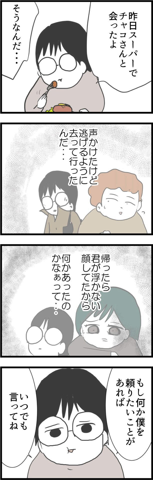 チャコと偶然スーパーで会った夫が、彼女に声をかけるとそそくさとその場から去っていったのだそう。