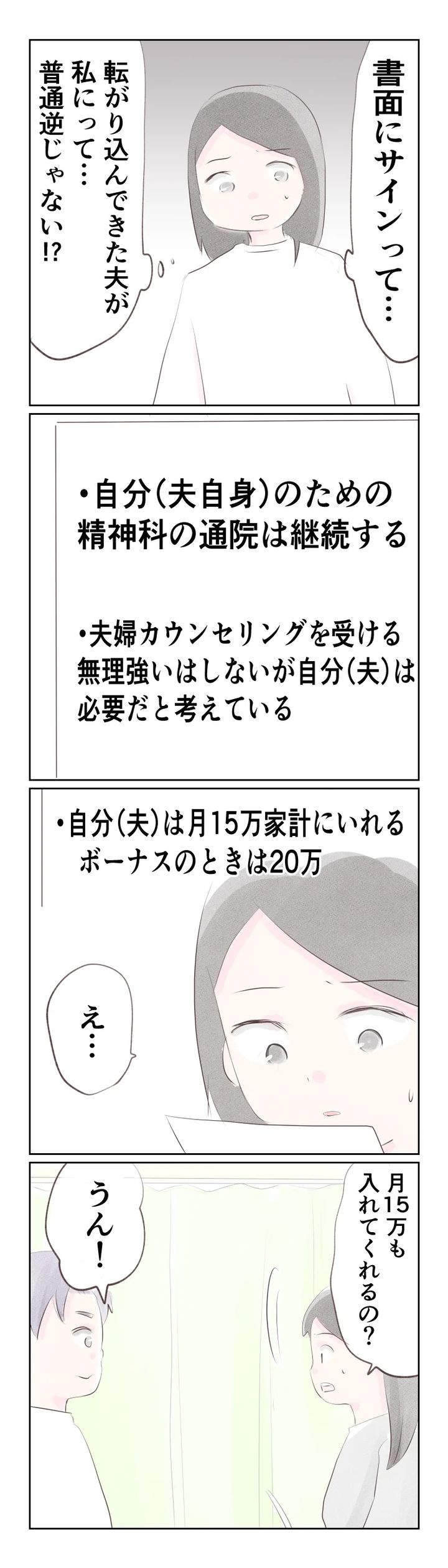 転がり込んできたわりに先に条件を提示してきたユウタさん。書面には通院を続けたいこと、夫婦カウンセリングを受けたいことなどが書かれていました。