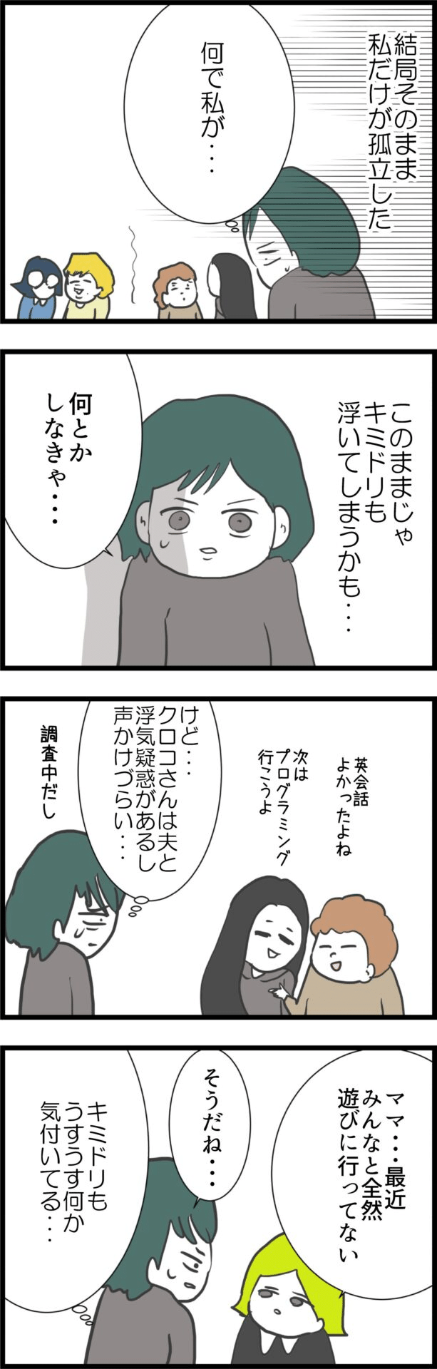 自宅で飲み会をママ友4人と楽しんでいた主人公・ミドリ。寝落ちしてしまい、夜中に目が覚めると夫と誰かがただならぬ会話をしているのです…! 翌朝ママ友たちから情報を集めると、キイコが夫を誘惑するような態度だったことからキイコを疑う妻。しかしその時に最も嫉妬していたのがクロコであり、クロコが帰宅したのを誰も見ていないということを知り、クロコに裏切り疑惑が浮上。キイコのアドバイスで探偵を雇い、しばらく様子を見ることに。ある日幼稚園のお迎えに行くと、ママ友グループが分裂してしまい、なぜか妻だけ孤立。娘がいつも通りみんなで公園に行きたいと言うと、チャコとクロコは英会話教室に、キイコとアオコは体操教室に行くと言って帰ってしまいました。どちらにも声をかけられていない妻はどうしてこうなってしまったのかと、モヤモヤが止まらないのでした。