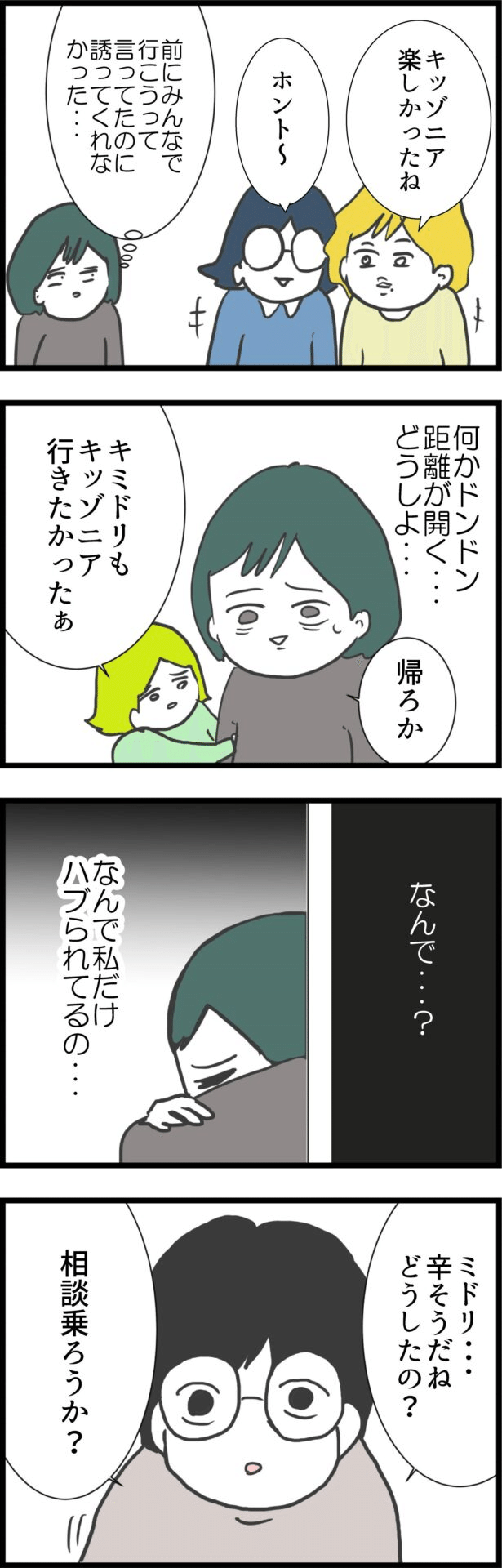 2. 「なんで私だけ…」ママ友たちとの距離は広がるばかり…心配して声をかけてくれたのは?【うちの夫と関係が!? 怪しい4人のママ友 Vol.25】