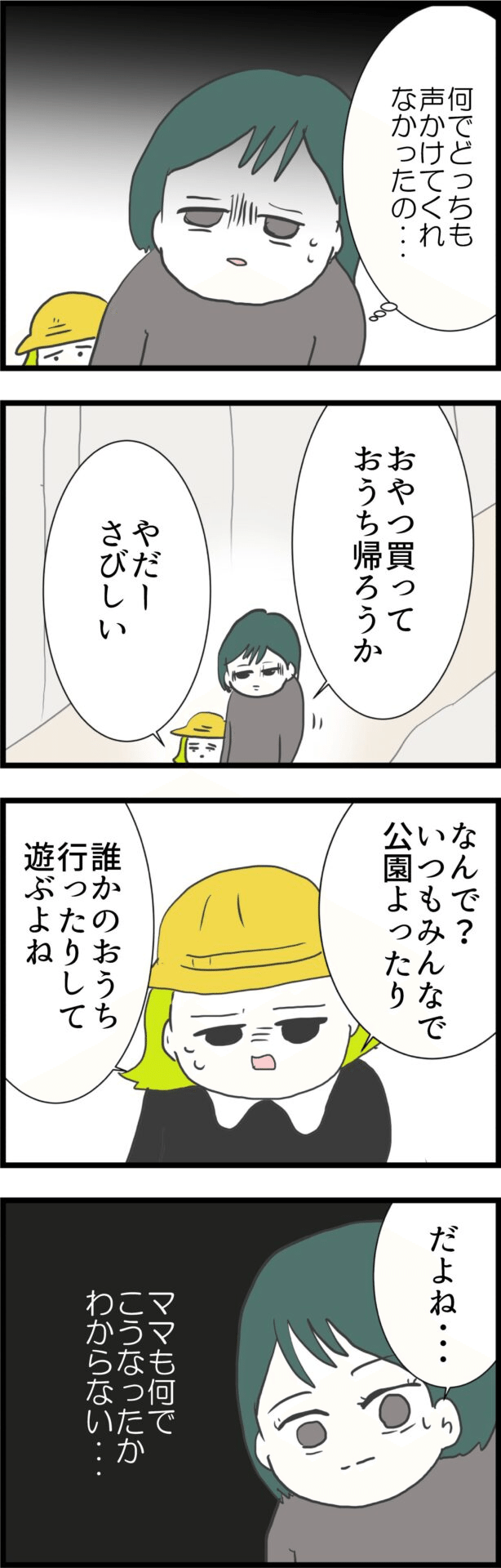 飲み会の一件で、せっかく仲良くなったママ友たちとの間に亀裂が入っただけでなく、子どもにも寂しい思いをさせてしまい複雑な気持ちでいっぱいになるミドリ。