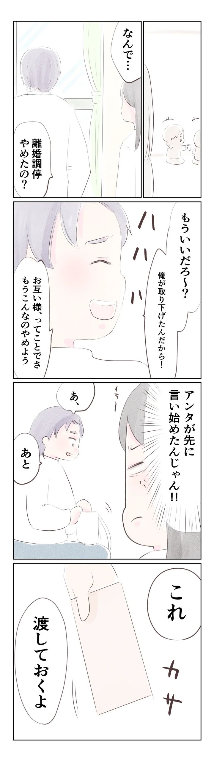 いつの間にか借金を重ねていたユウタに怒った妻の美穂。しかしユウタは美穂に叱られたことを暴言ととらえ、仕返しを企みます。ユウタは美穂が怒っている声を録音し離婚調停を申し出ました。調停委員たちはユウタの言葉を信じ調停はなかなか進まず、美穂は子どもたちと会えない日々に。やっと会った子どもたちは家族で暮らすことを希望。美穂は子どものために再構築を考えたいのですが、ずっと美穂に敵意を露わにしてきたユウタが応じるとは思えないでいました。しかしある日突然、調停が取り下げられたと聞かされます。