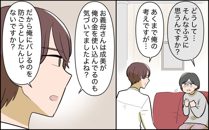 義母は自分のせいで娘が暴走したことを悔やみ、また同様に妻がセミナーにハマったのは自分の過去の行いが原因だと思ってきた。それでも夫は妻との離婚に踏み切るために、義母が持っている情報を聞き出すことに。そこで義母が妻の派手な買い物を支えてきたことが明らかに。さらに隠していることがあるのではと詰め寄る夫に…。