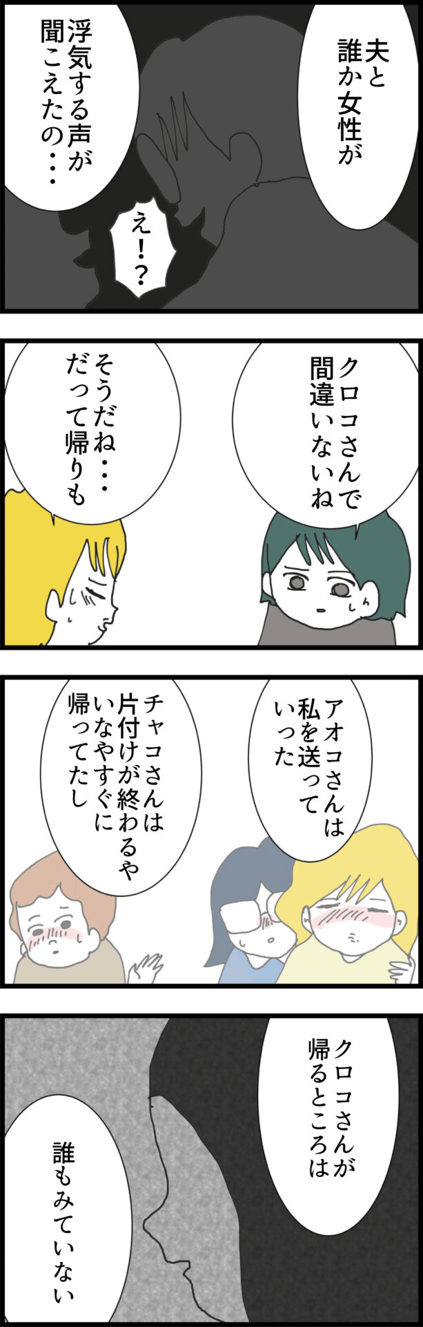 4人のママ友と自宅で飲み会を楽しんでいた主人公・ミドリ。途中で寝落ちしてしまい、夜中に夫と誰かの怪しげな会話を耳にしてしまいます。翌日、寝落ちしている間にいろいろなことがあったことを知った妻。夫にベタベタするキイコ、それを注意するチャコ、2人の言い合いを笑って見ていたアオコ、キイコは今夫の裏切りで悩んでいること…。さらにキイコは地元では有名な略奪妻だという噂を聞いて、夫と関係を持っているのはきっとキイコだと考えた妻。するとキイコが訪ねてきて昨夜のことを謝罪してきました。そして、夫に本当に好意を持っているのはクロコだと宣言。どうやら昨夜、キイコとクロコが2人きりになった途端、すごい勢いで睨みつけ怒ってきたのだそう。そのあとクロコは夫のもとへ駆け寄り2人でなにか話しこんでいたと言います。