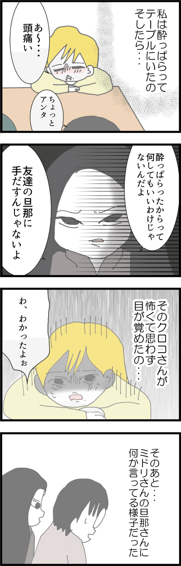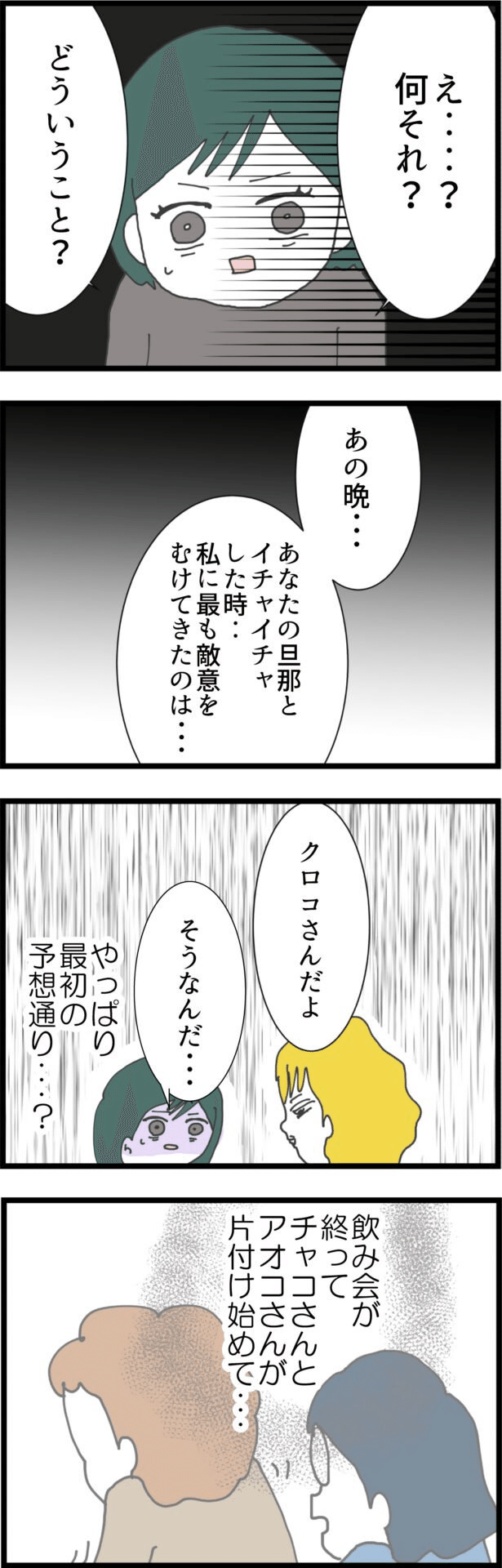 主人公・ミドリは、4人のママ友と自宅で飲み会を楽しんでいましたが、途中で寝落ちしてしまいます。そして夜中、夫と誰かがただならぬ会話をしているのを耳にします。翌朝、ママ友たちに話を聞くと、キイコがミドリの夫とイチャついているのをチャコが注意し、その様子をアオコが嘲笑っていたという話を聞かされます。また、キイコを家まで送ったアオコは、キイコが夫の裏切りに悩んでいることを知ったとも話します。ただ、その裏切りは元々キイコが先に裏切ったことへの仕返しだという噂も耳にし、ミドリは「やはり夫の相手はキイコか」と思い始めます。しかし、一度帰宅したキイコがわざわざ戻ってくるだろうか、と疑問を抱きます。そんな中、突然キイコが訪ねてきて、昨日のことを謝罪します。「夫とどうこうなるつもりは全くない」というキイコの言葉には、嘘は感じられません。さらに、キイコは「夫と関係を持っていそうな人を知っている」と言い出し…。