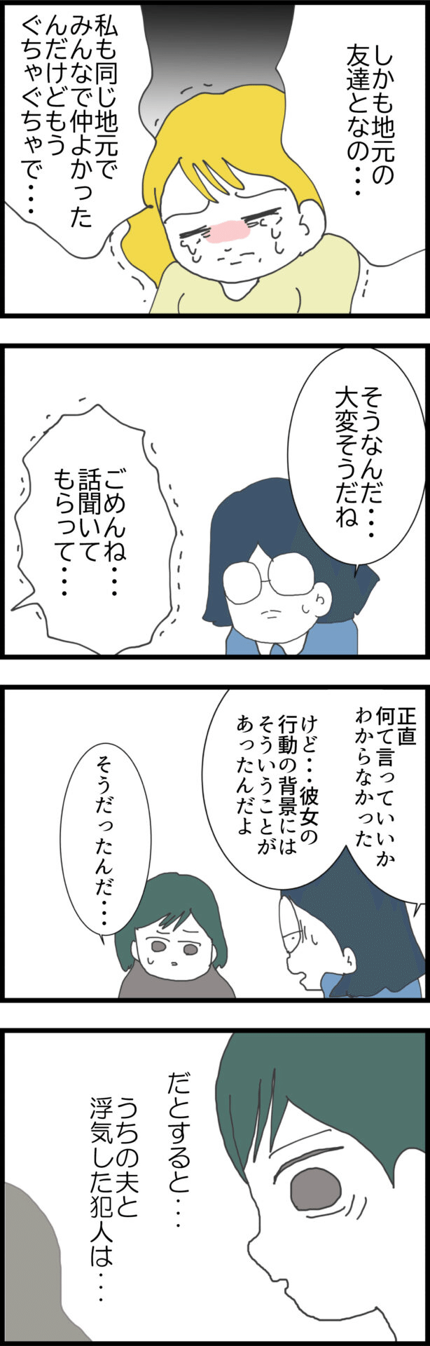 夫の裏切りが発覚したキイコが、とても辛い思いをしていることを知ったアオコ。相手は地元の友達のため、夫とも友人ともギクシャクしてしまい、誰にも相談できなかった様子。