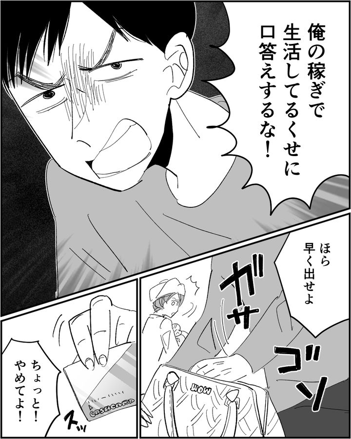 キャッシュカードを取り上げ、「毎月決まった額だけ、現金を渡す」という夫。友だちの言葉が頭をよぎり、生活費が足りていない状況をなんとか伝えようとしますが、夫は話を聞いてくれません。
