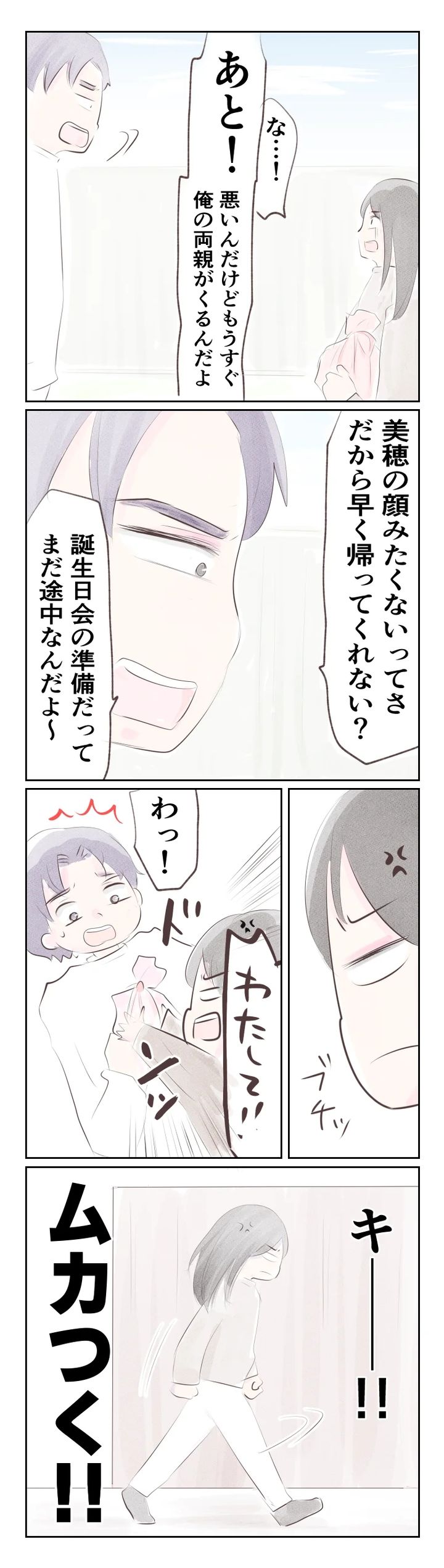 実家に戻った美穂でしたが、娘の誕生日を祝うためプレゼントを持って家に行きます。すると家に入らせてもらえず、ユウタに「迷惑」と言われるのでした。