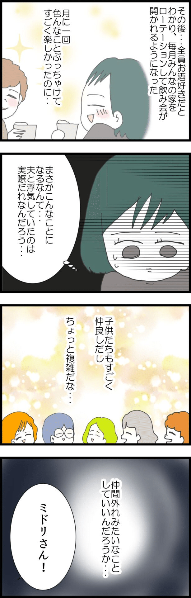主人公・ミドリは自宅でママ友4人と飲み会を楽しんでいましたが、夫とママ友の一人が裏切り行為を働いているのでは、という疑念が浮上します。翌日、ママ友のチャコから昨晩、キイコがミドリの夫にベタベタしていたと聞かされます。ミドリが昨夜の疑惑を相談すると、チャコは急に態度を変え、「キイコではない」とだけ言い残して帰ってしまいました。次に現れたのは、一番怪しいと思っていたクロコ。彼女から、ママ友同士のケンカをアオコが面白がっていたという話を聞かされます。アオコの本性にドン引きするミドリでしたが、さらにクロコが「非常識なキイコをグループから外そう」と提案してきて、再び驚くのでした。