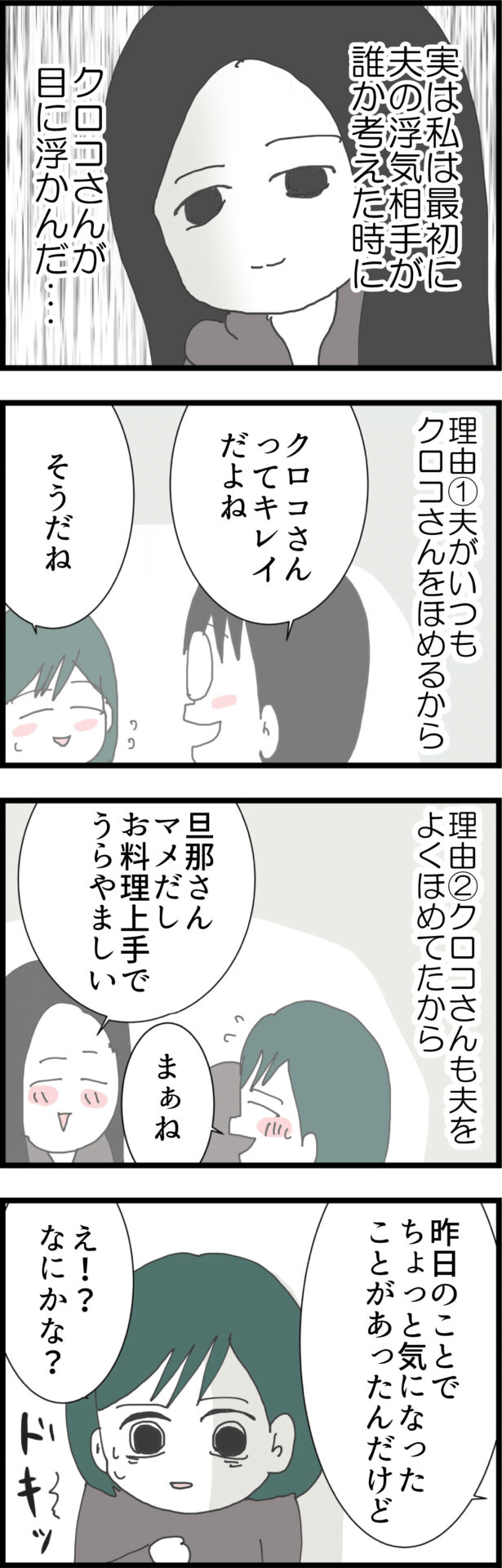元々4人のうちでクロコが一番怪しいと思っていた妻は、クロコのすべての行動が怪しく見えてしまいます。