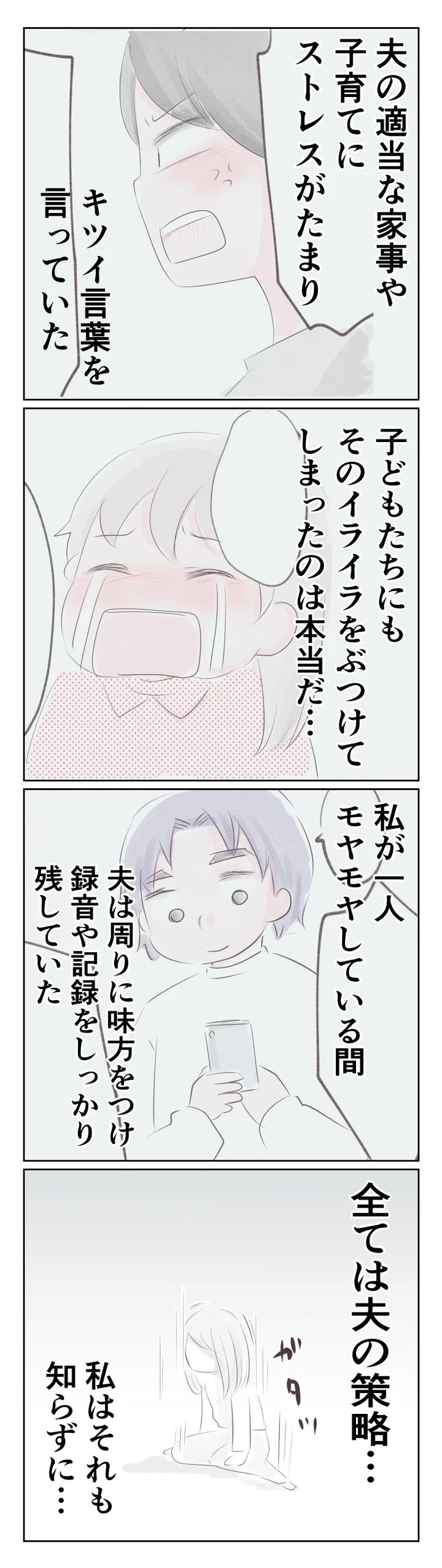 夫のユウタが借金しローンを滞納していたことを知った美穂。一度は実家に戻りますが、夫に謝罪され再構築を選びます。再構築後の夫は家事を積極的にやり始めますが、何をしてもすべて中途半端で、かえって美穂のストレスに。ついイライラして子どもに当たってしまいますが、その音声をユウタに録音されてしまいます。彼は美穂が子どもや自分に暴言を放っていると訴え、離婚すると言い出しました。すでに両親や職場にも根回し済みで、美穂は夫を追いつめる妻と思われていたのでした。