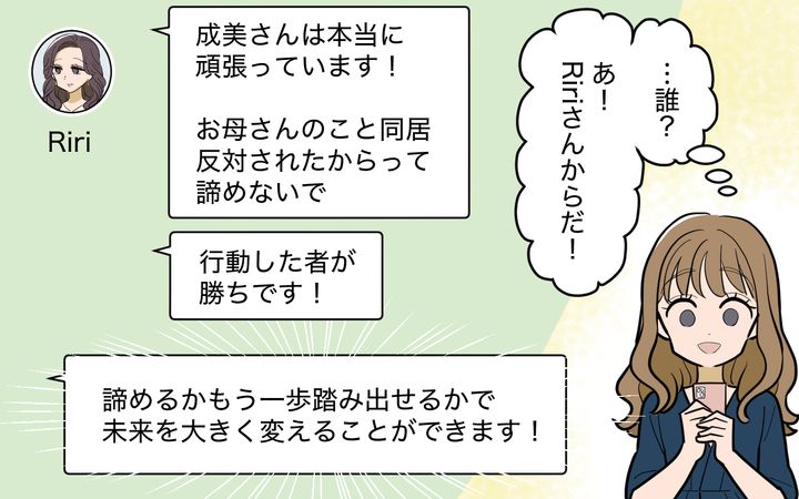 歳を取った母をひとりにすることもしたくないし、ましてや心細くなっているところに施設に入所させてしまうことも娘としてはしたくありませんでした。そんな時にいつも私を助けてくれる女性から励ましのメッセージをもらい…。