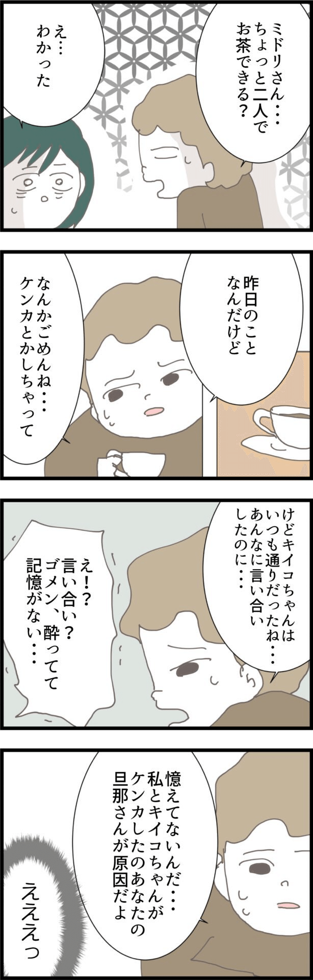 チャコによれば、昨日の飲み会でキイコとケンカをしてしまい、そのことを気にしているのだとか。そして、そのケンカの原因は、なんとミドリの夫だというのです…!?