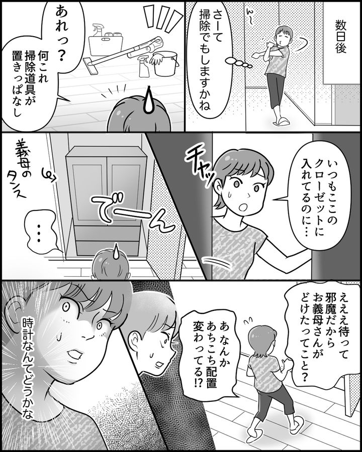 数日後、なぜか掃除道具が廊下に放置されていて…クローゼットを開けたら義母のタンスが…!思い入れのある時計まで、別のものに変えられていたのです。さらに義母は由美の服装にも文句を言い出して…。